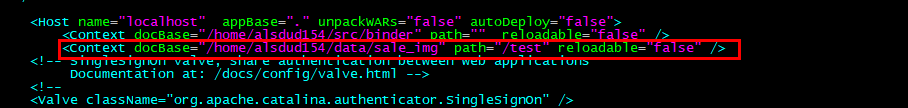 $ vim /usr/local/apache-tomcat-8.5.47-binder/conf/server.xml <Context docBase="/home/alsdud154/data/sale_img" path="/test" reloadable="false" />