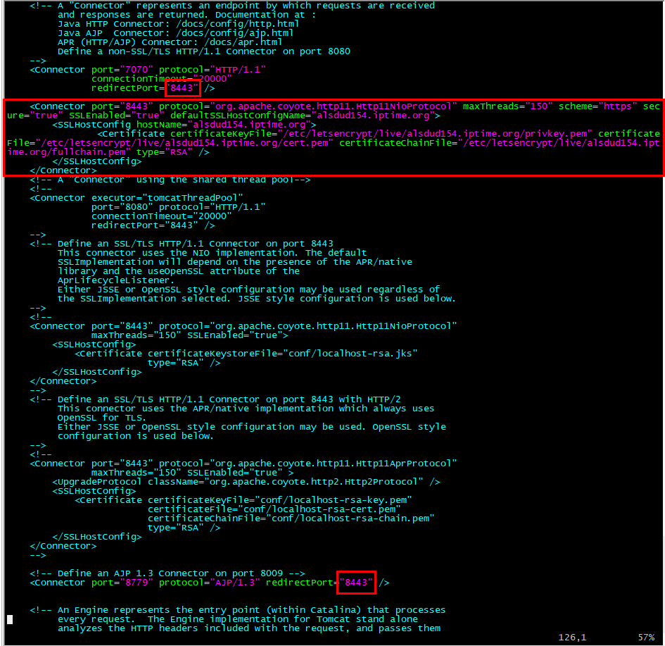 $ sudo chown -R alsdud154:alsdud154 /etc/letsencrypt/Tomcat의 server.xml을 실행 후 Connector를 추가하고 redirectPort를 추가한 Connector와 같은 포트로 수정한다.