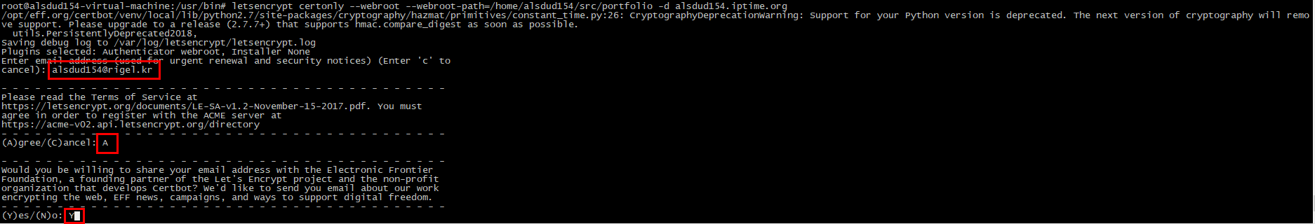 # cd /root # wget https://dl.eff.org/certbot-auto # mv certbot-auto /usr/bin/letsencrypt # chmod 755 /usr/bin/letsencrypt # letsencrypt certonly --webroot --webroot-path=/home/alsdud154/src/portfolio -d alsdud154.iptime.org