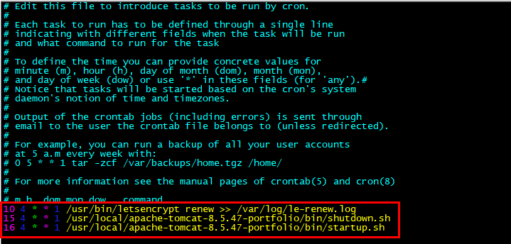sudo chmod -R 777 /usr/bin/letsencrypt sudo chmod -R 777 /var/log/ // 3번 입력 $ crontab -e 10 4 * * 1 /usr/bin/letsencrypt renew >> /var/log/le-renew.log 15 4 * * 1 service portfolio restart