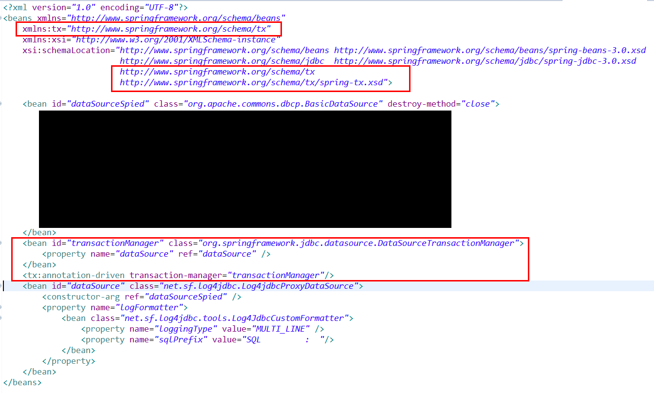 <beans xmlns:tx="http://www.springframework.org/schema/tx" xsi:schemaLocation="http://www.springframework.org/schema/tx http://www.springframework.org/schema/tx/spring-tx.xsd"> <bean id="transactionManager" class="org.springframework.jdbc.datasource.DataSourceTransactionManager"> <property name="dataSource" ref="dataSource" /> </bean> <tx:annotation-driven transaction-manager="transactionManager"/>