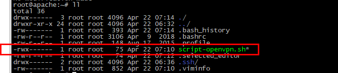 $ sudo su - # vim script-openvpn.sh #!/bin/bash cd /etc/openvpn sudo openvpn --config /etc/openvpn/apache.ovpn # chmod -R 700 script-openvpn.sh