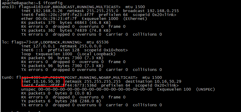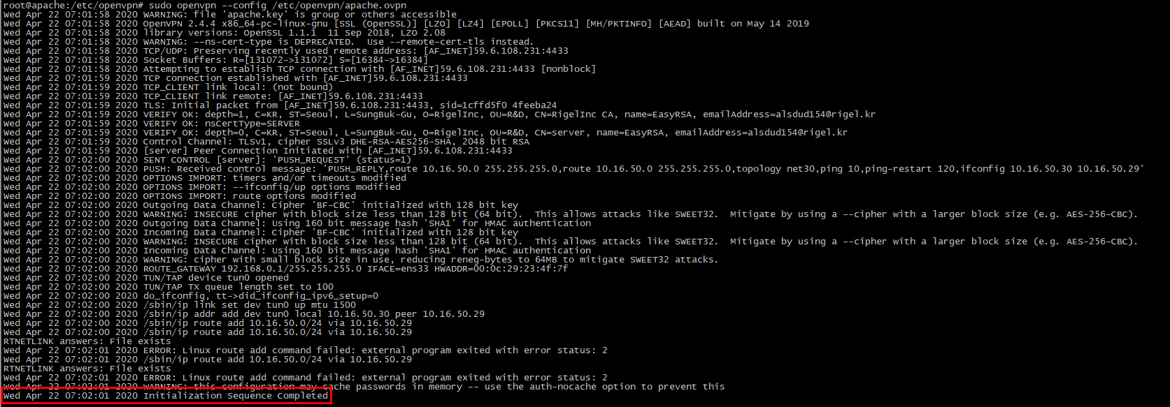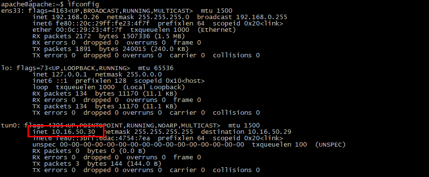 # sudo openvpn --config /etc/openvpn/client-apach.ovpn