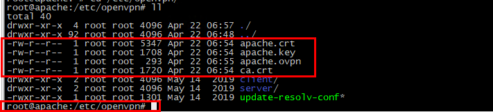 ca.crt apache.crt apache.key apache.ovpn 인증서 파일이 필요하다.