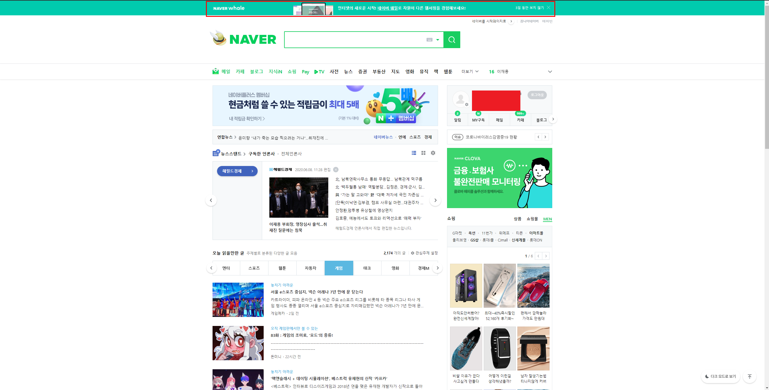 필자는 크롬 브라우저를 자주사용하는데 네이버에서 수시로 웨일을 사용하라는 상단 팝업이 노출된다.