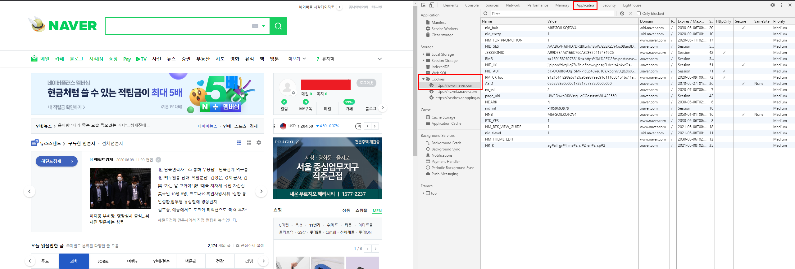 그다음 F12번을 눌러 Application > Cookies > https://www.naver.com 을 클릭한다.