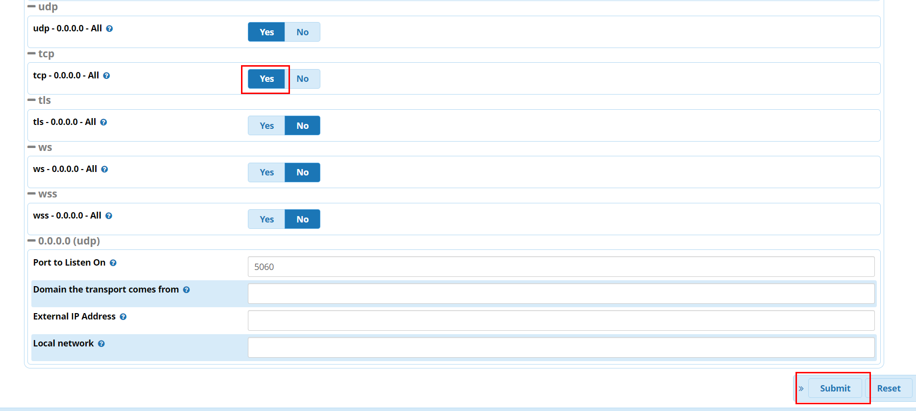 tcp Yes로 변경 후 저장한다.