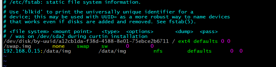 # vim /etc/fstab 192.168.0.15:/data/img /data/img nfs defaults 0 0