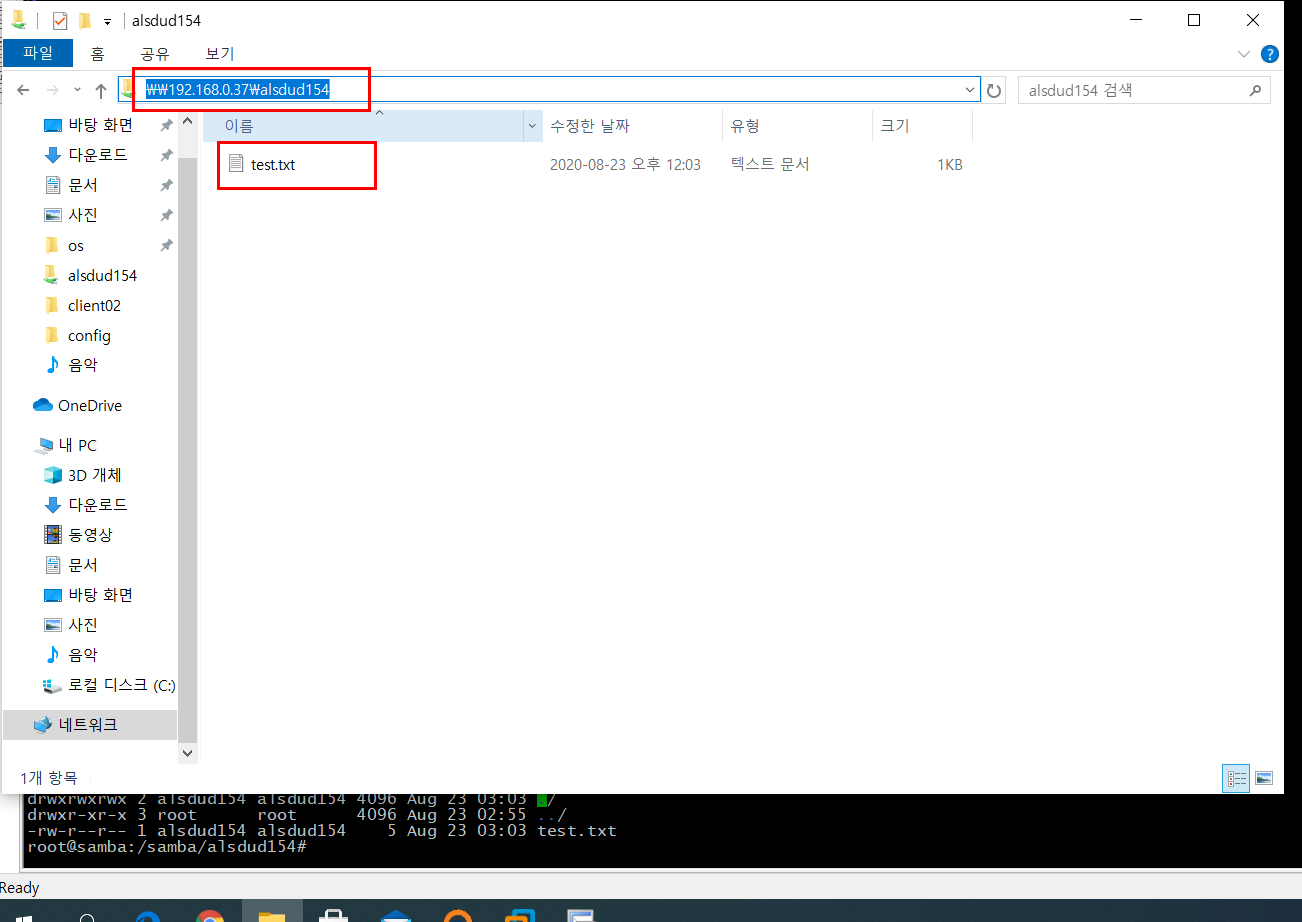 # cd / # mkdir samba # cd samba # mkdir alsdud154 # chown -R alsdud154:alsdud154 alsdud154 # chmod 777 alsdud154 # vim test.txtsmb.cnf 파일 맨 밑에 해당 명령어를 추가한다.