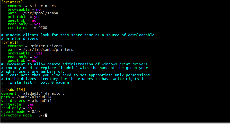 # vim /etc/samba/smb.conf [alsdud154] comment = alsdud154 directory path = /samba/alsdud154 valid users = alsdud154 writeable = yes read only = no create mode = 0777 directory mode = 0777