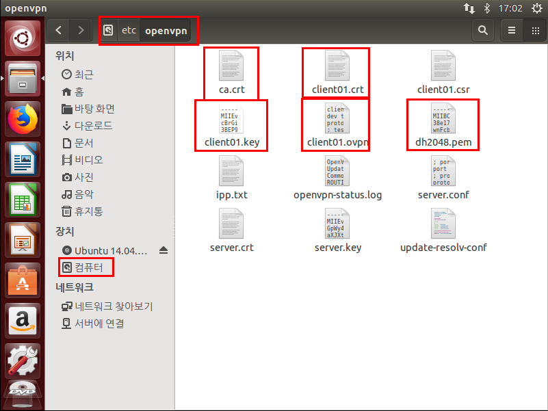# cp client01.* ca.crt /etc/openvpn/우분투 GUI에 root 계정으로 로그인해서 usb에 복사한 파일들을 가져오려고 한다.