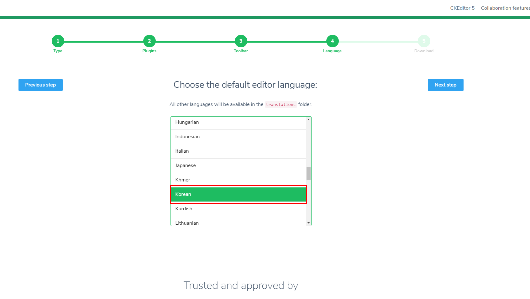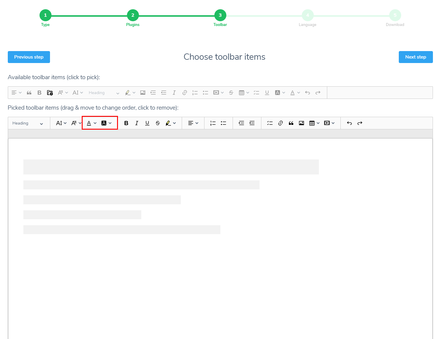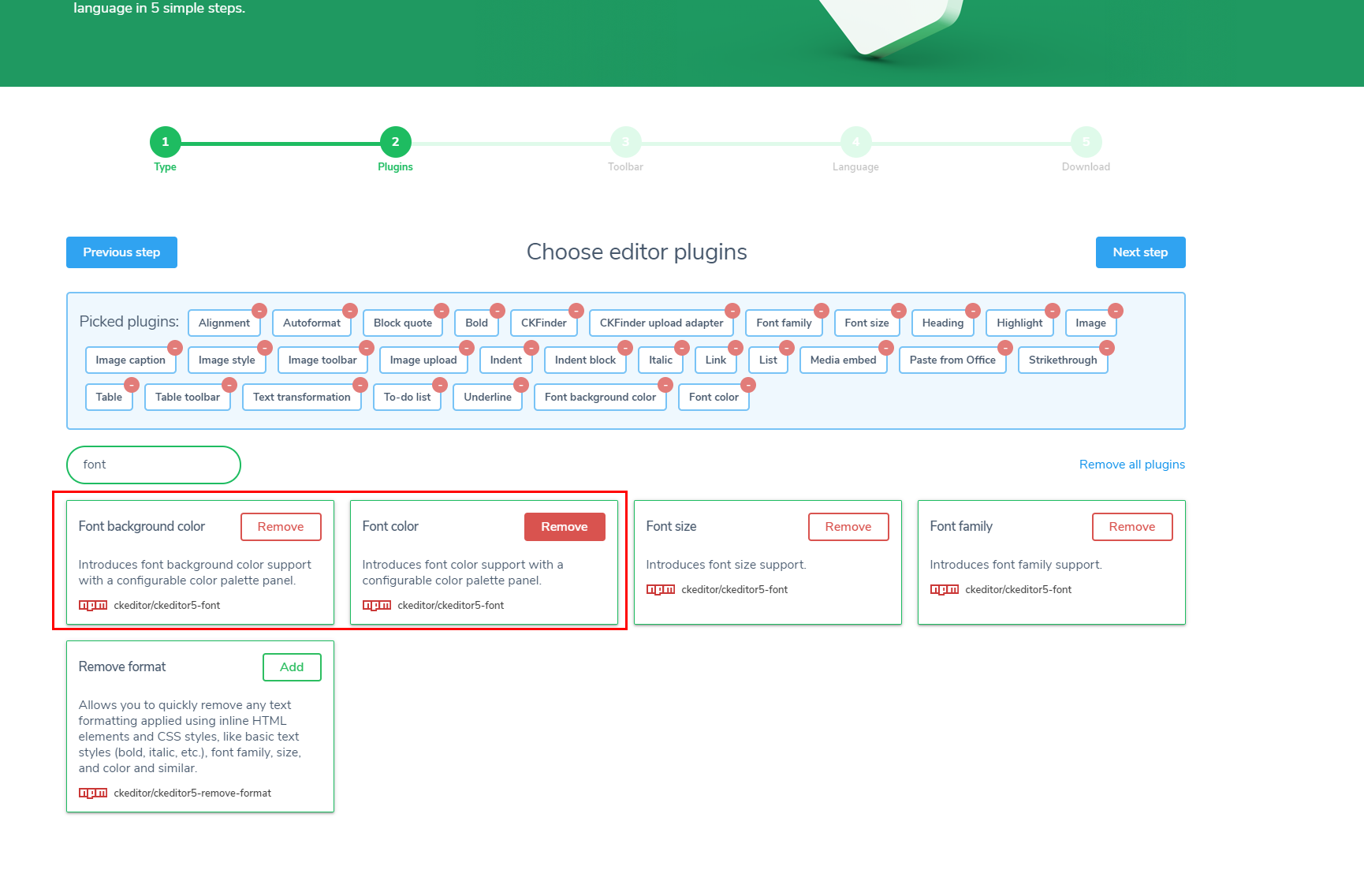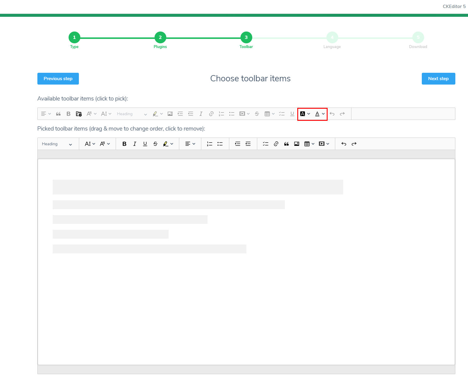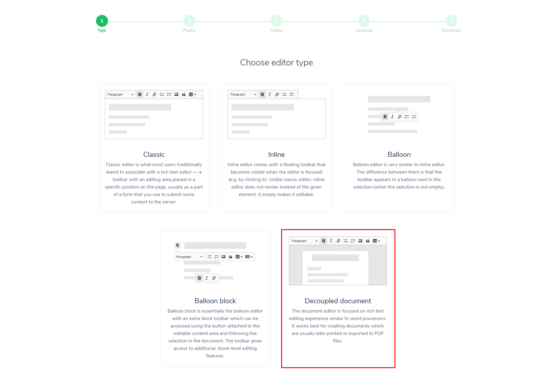 Create your own CKEditor 5 build with customized plugins, toolbar and language in 5 simple steps. Available rich text editor types are classic, inline, balloon, balloon block and decoupled document.