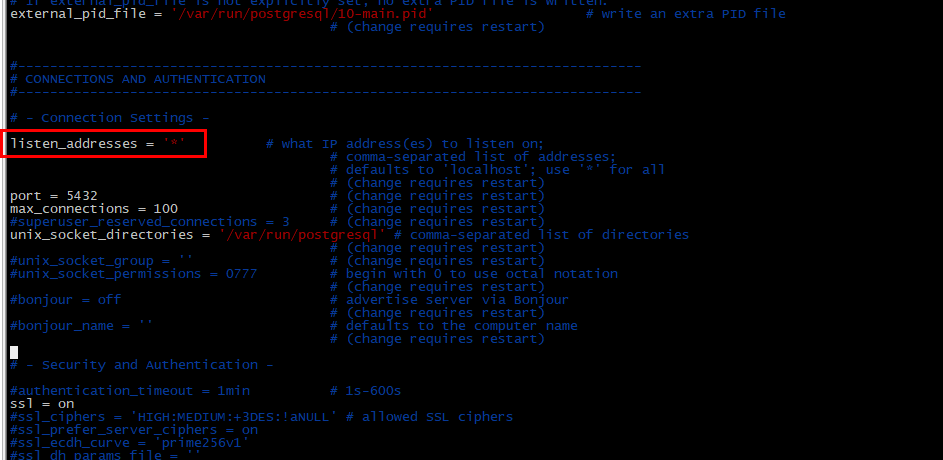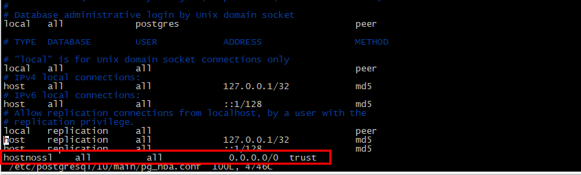 # vim /etc/postgresql/10/main/postgresql.conf listen_addresses = '*' # vim /etc/postgresql/10/main/pg_hba.conf hostnossl all all 0.0.0.0/0 trust