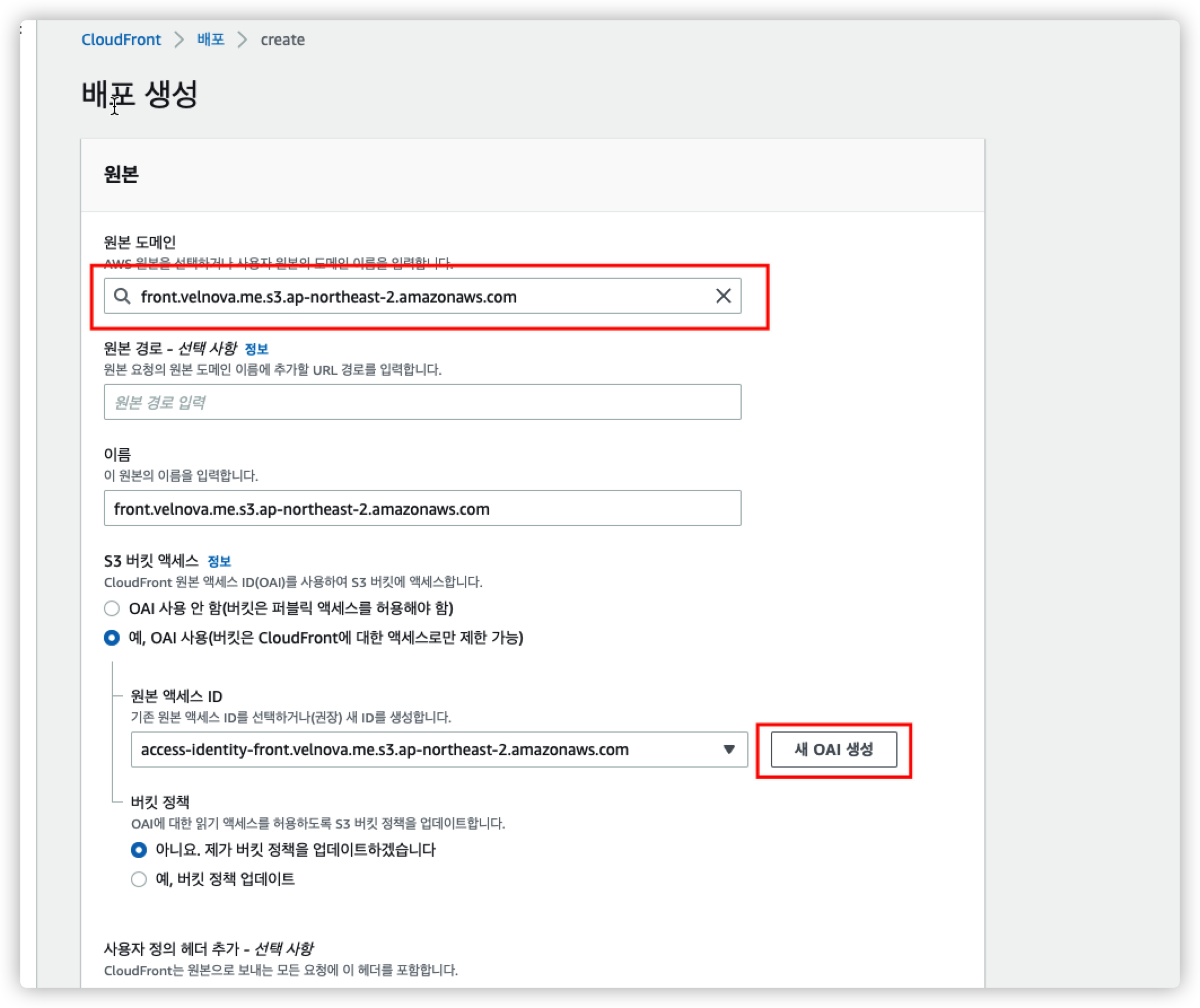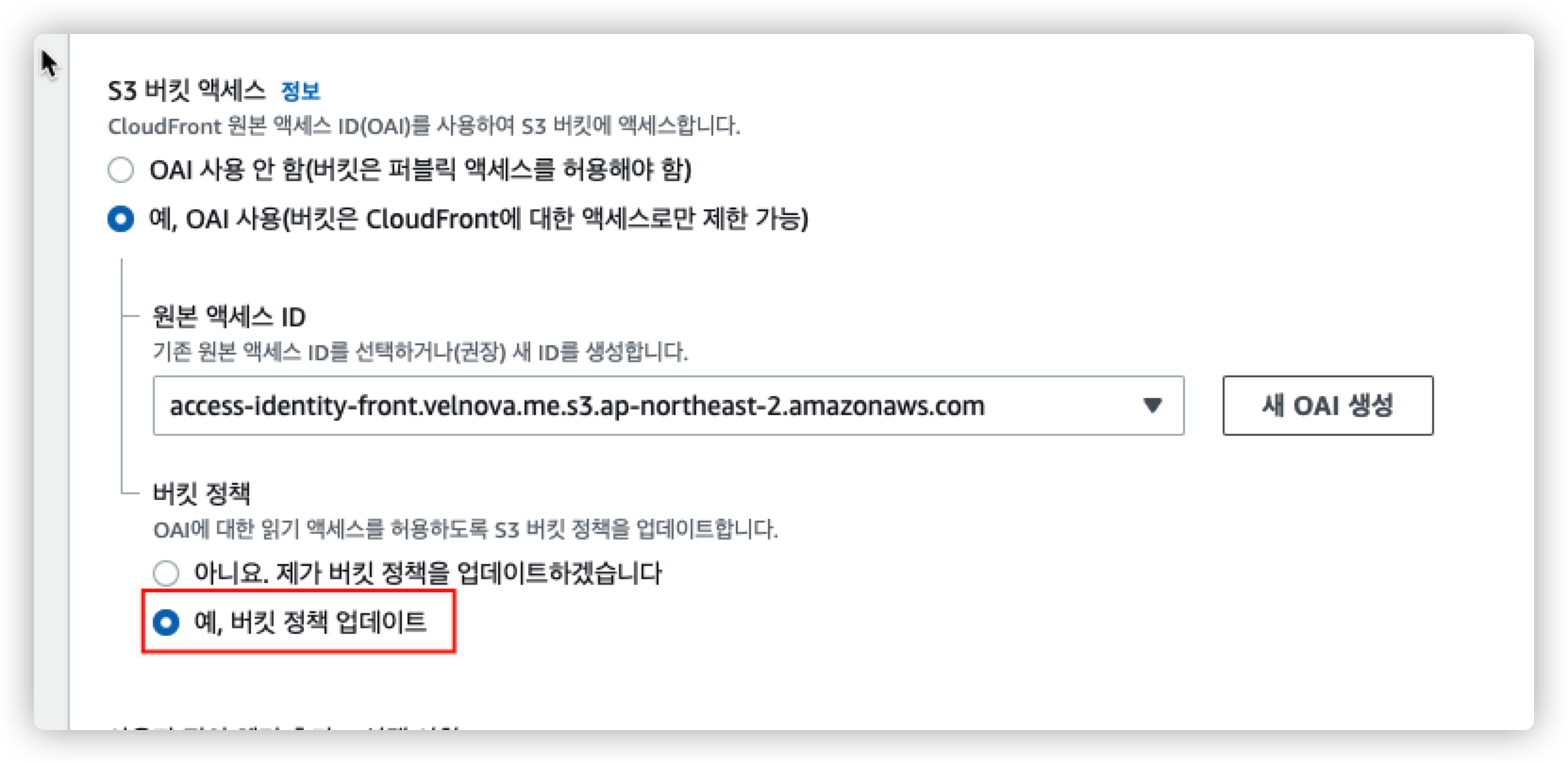 다음으로 S3 버킷은 CloudFront를 통해서만 접근함으로 S3 버킷 엑세스를 활성화 후 새 OAI 생성 후 선택한다.