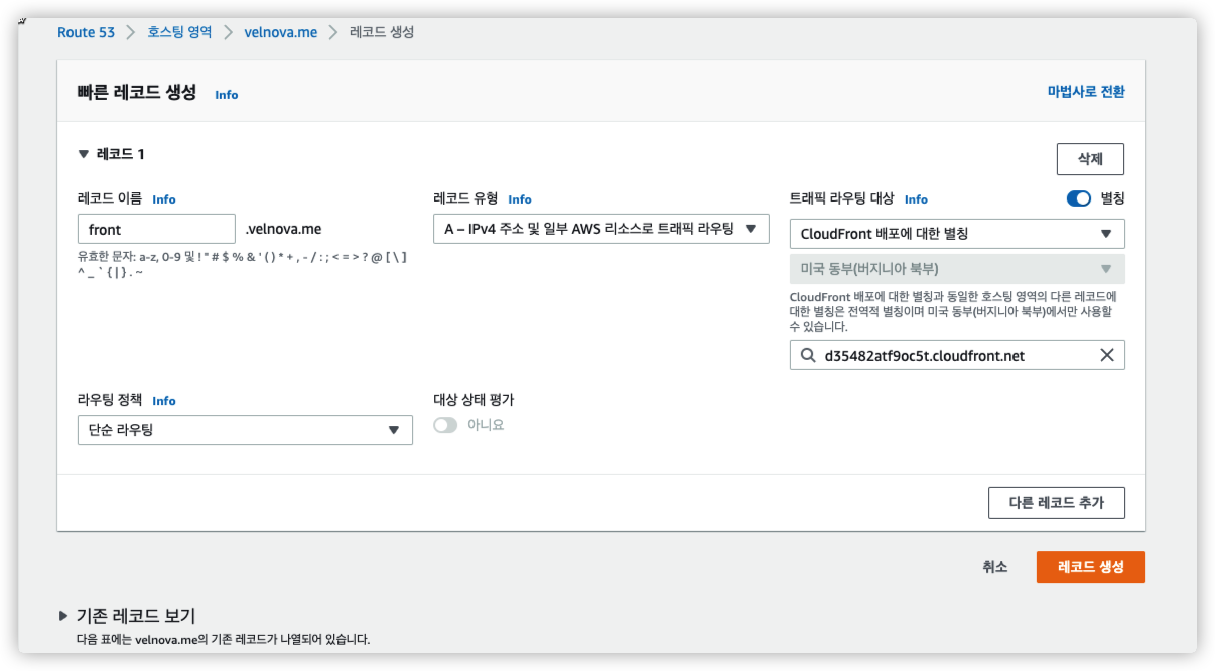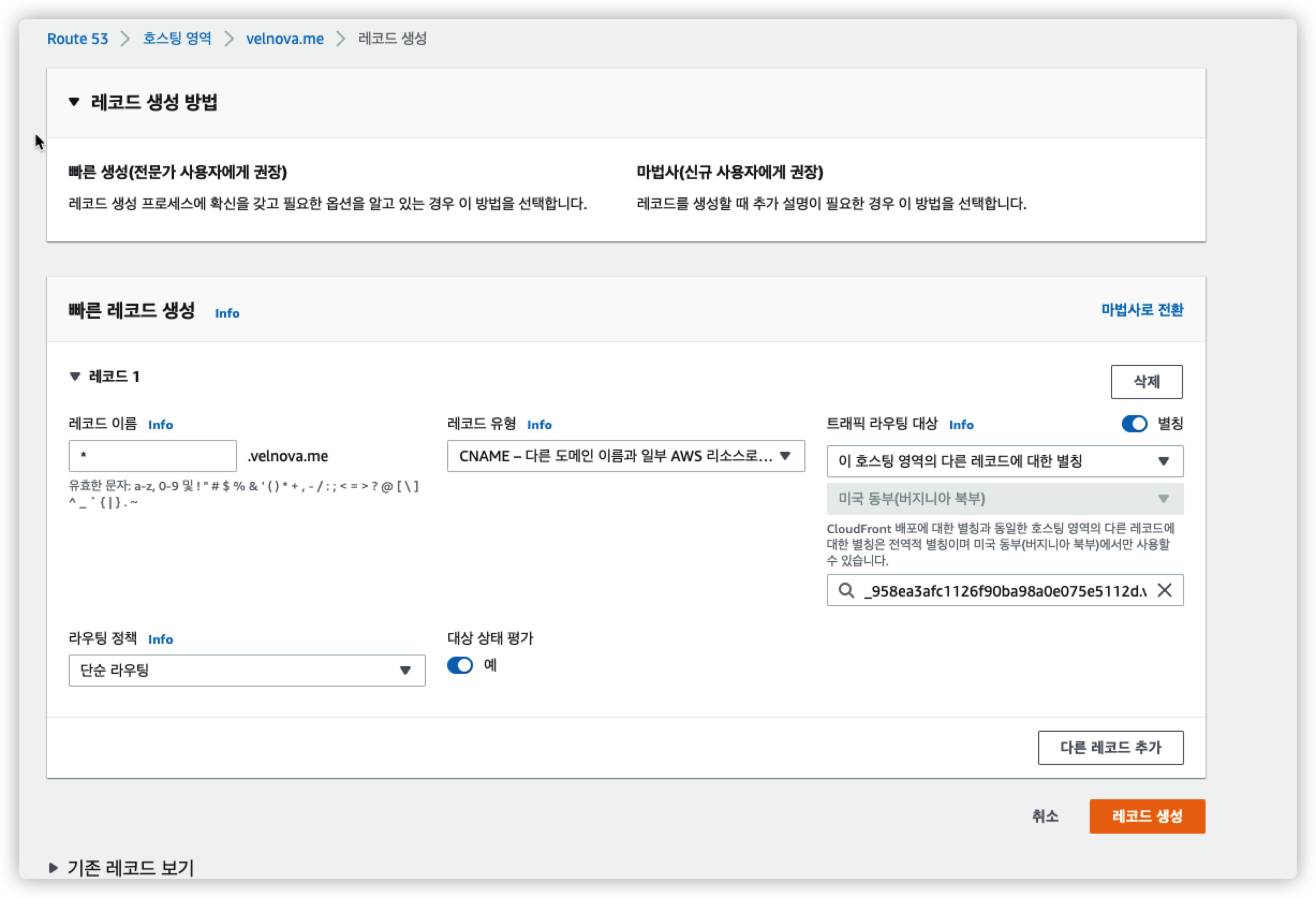 이제 레코드는 *를 사용하여 front.velnova.me, server.velnova.me 등으로 사용할 예정이다.