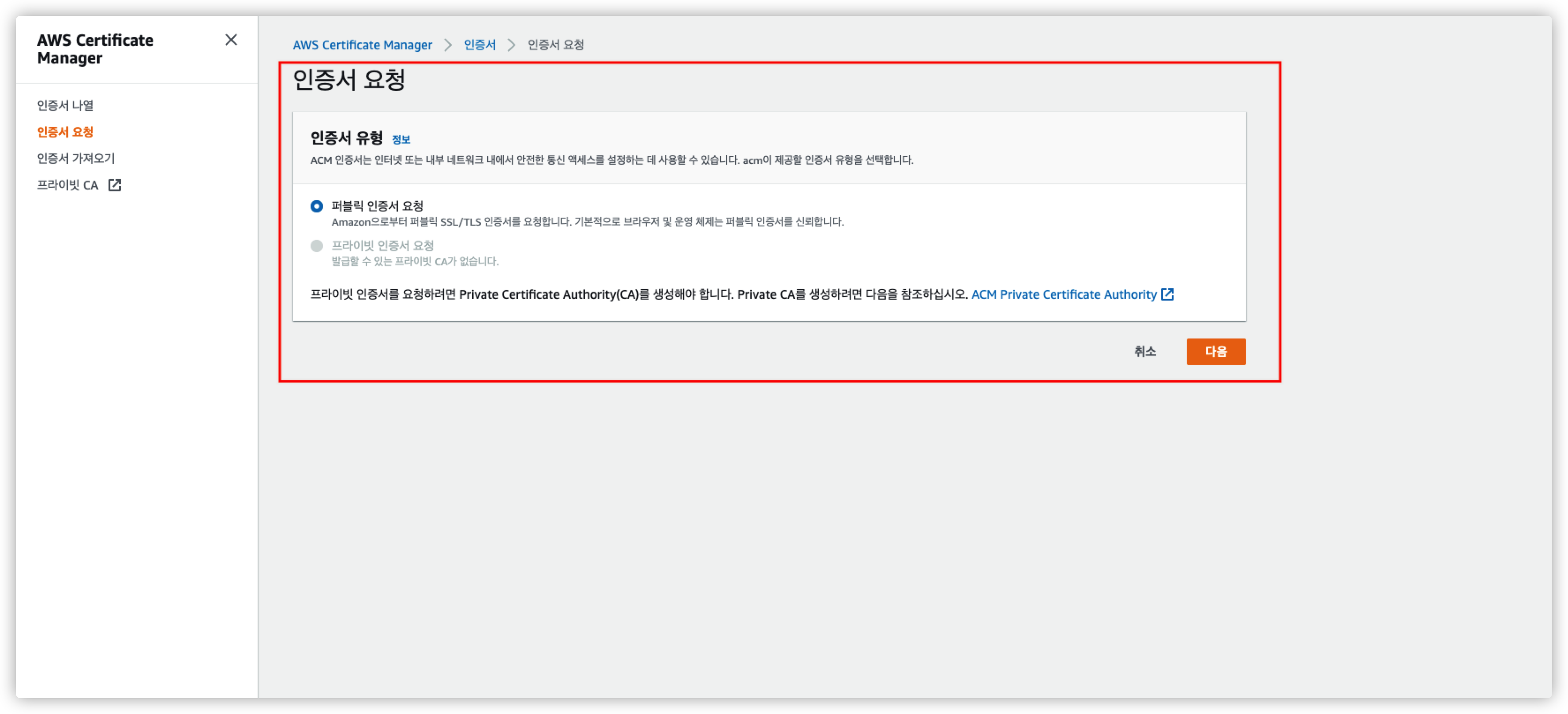 그래야만 CloudFront에서 인증서를 가져올 수 있다.
