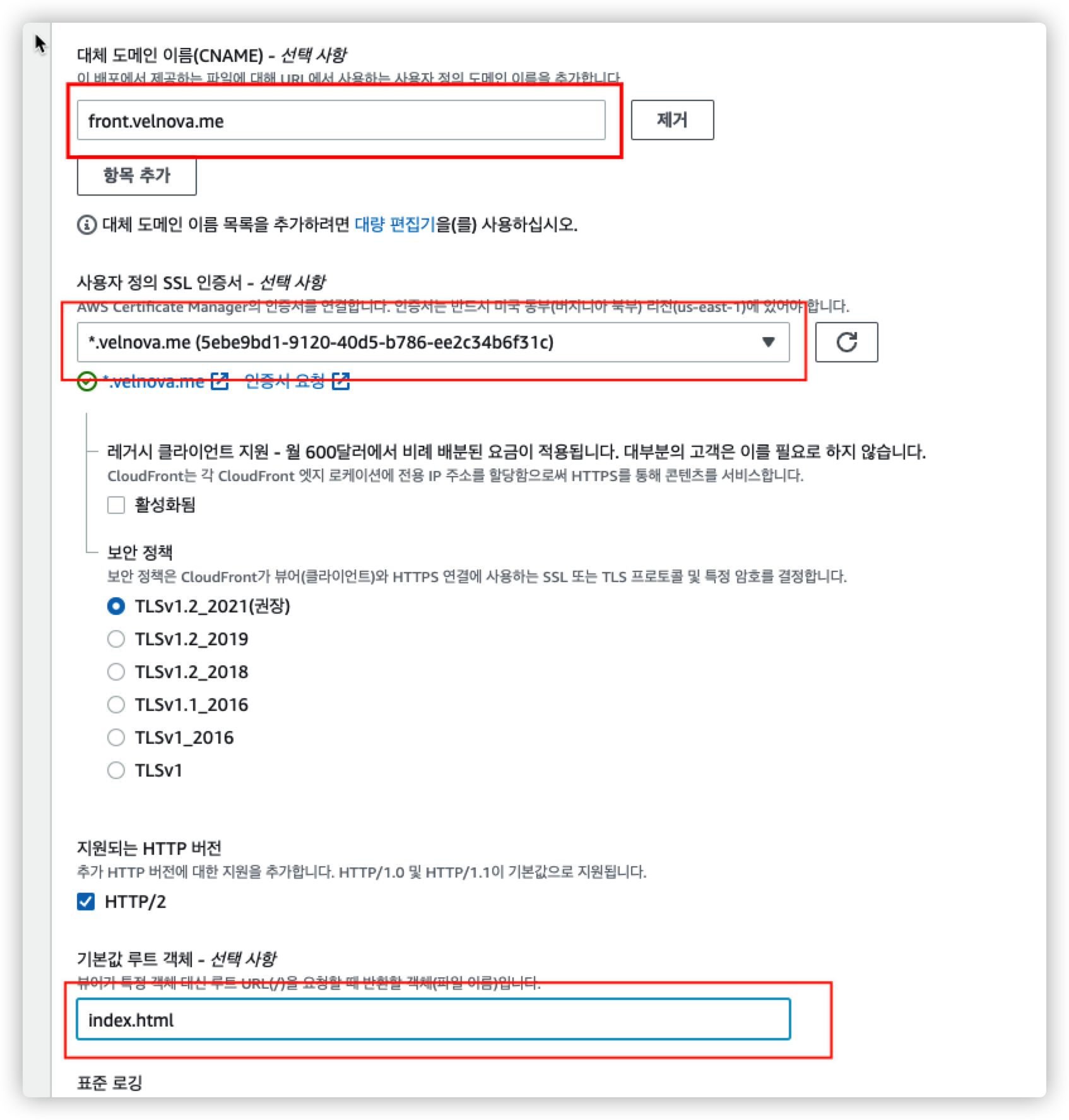 또 생성한 인증서를 선택 후 기본값 루트 객체를 S3 버킷에 업로드한 index.html로 설정후 생성한다.