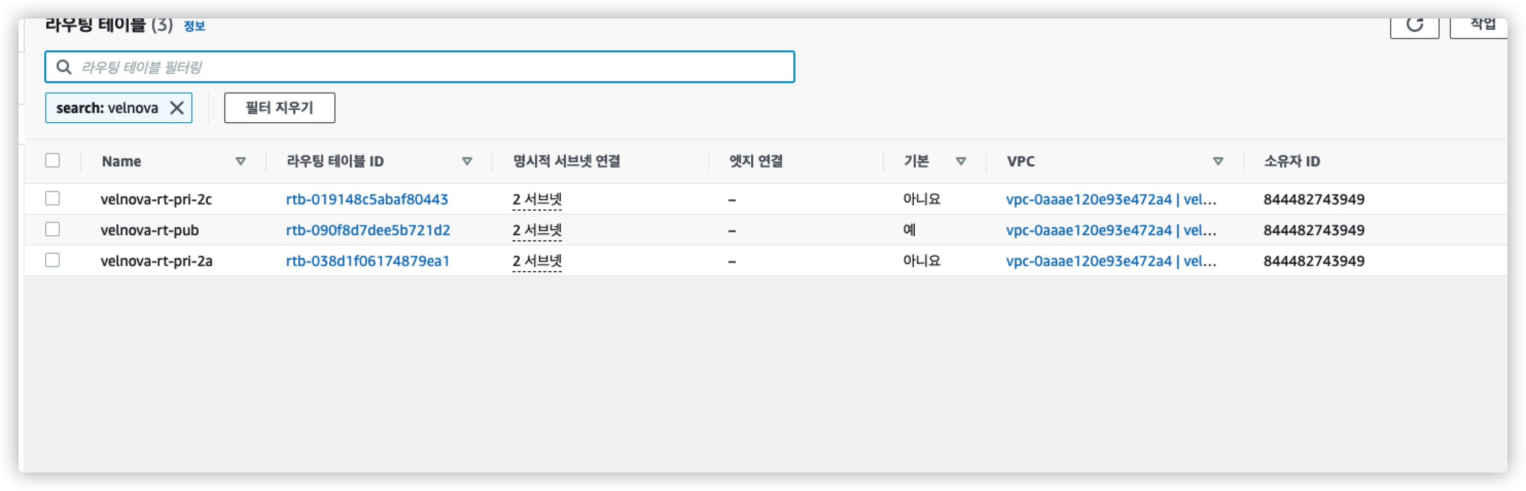 다음과 같이 라우팅 테이블은 pub 1개, pri 2개가 생성되어야 한다.