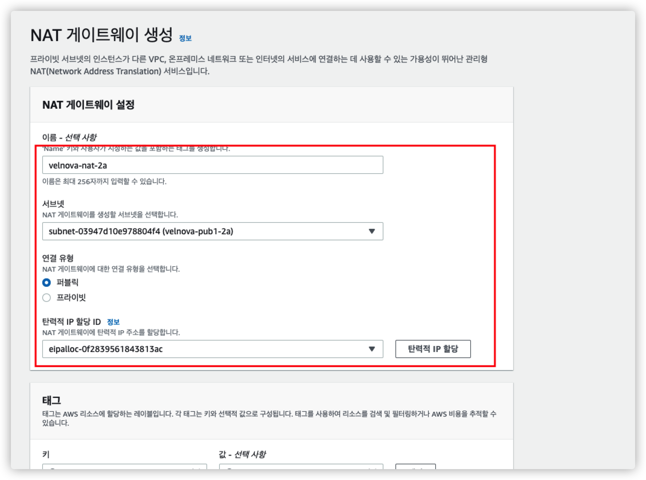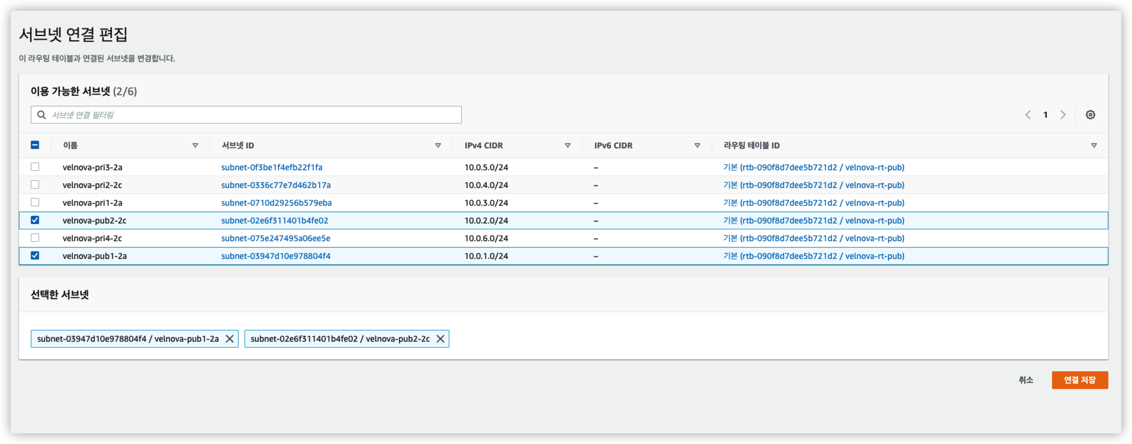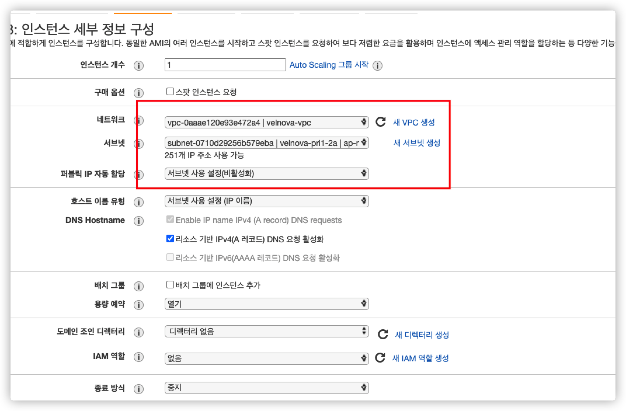 서브넷을 velnova-pub1-2a, velnova-pri-2a를 잘 확인하자.