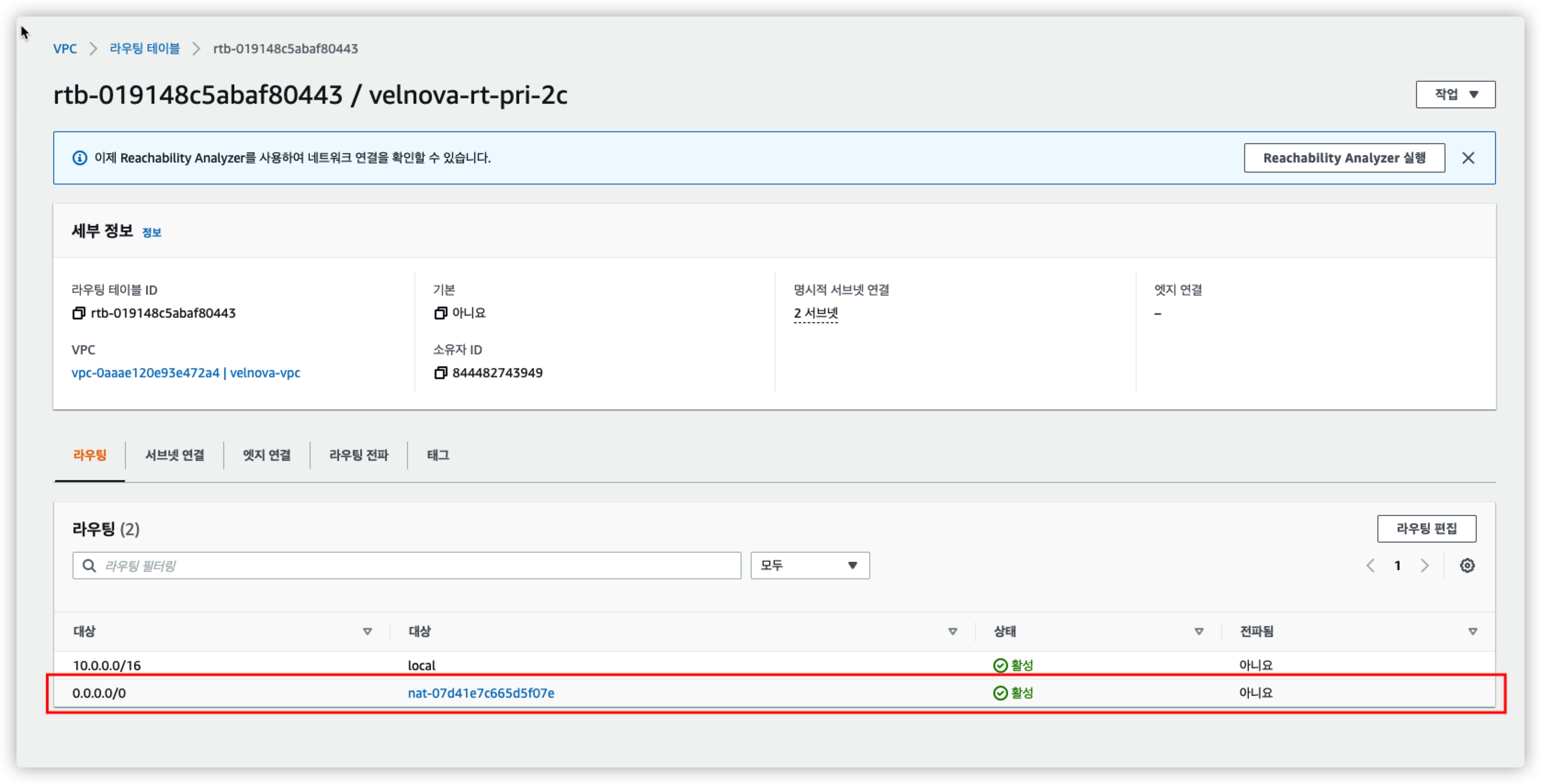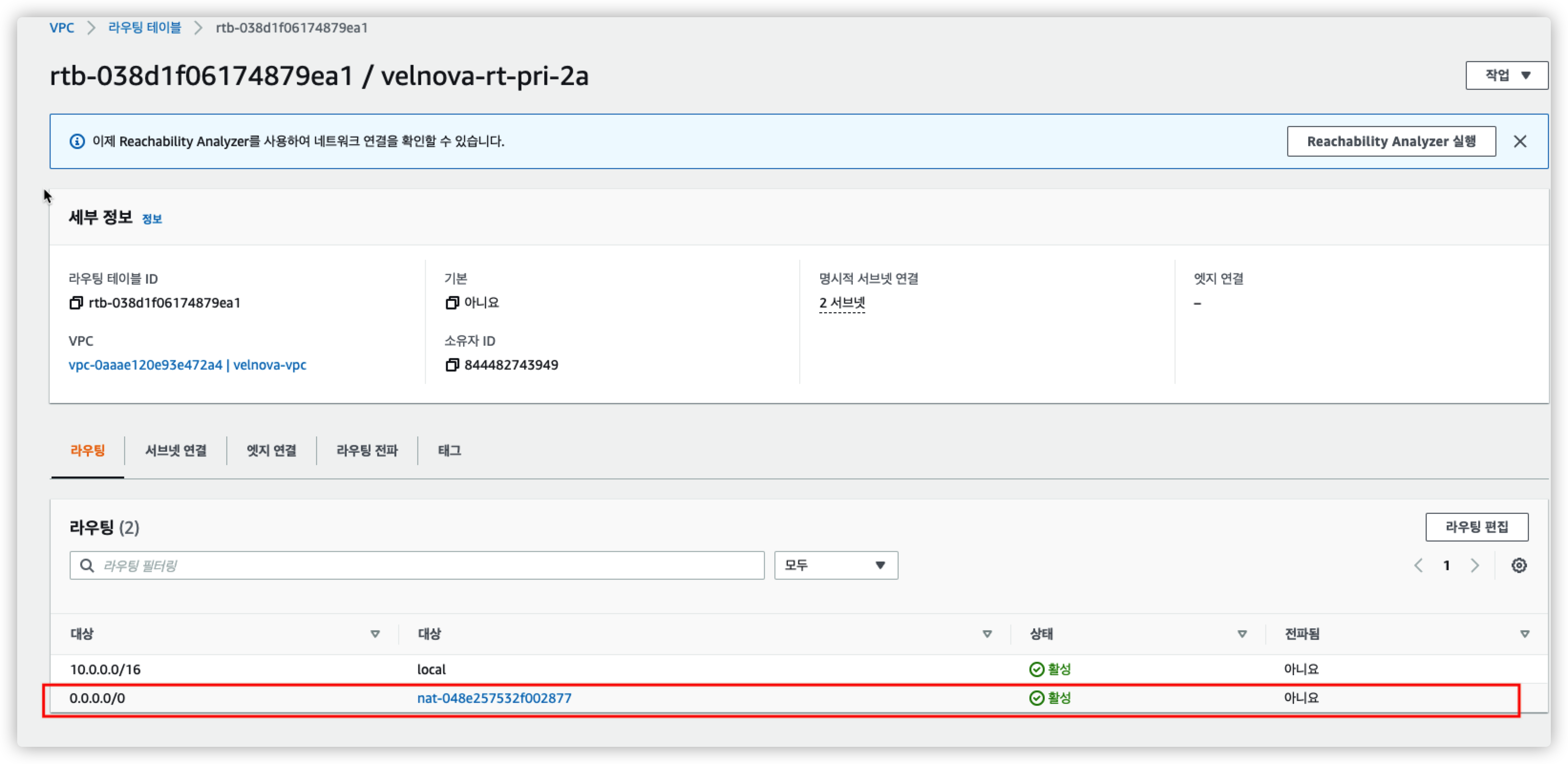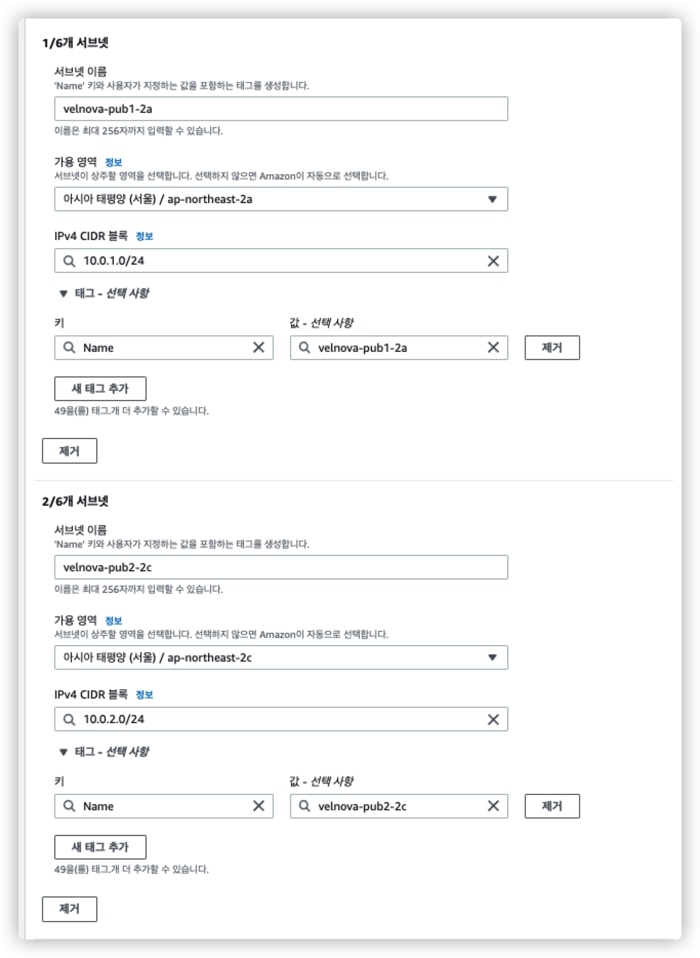 서브넷을 velnova-pub1-2a, velnova-pri-2a를 잘 확인하자.