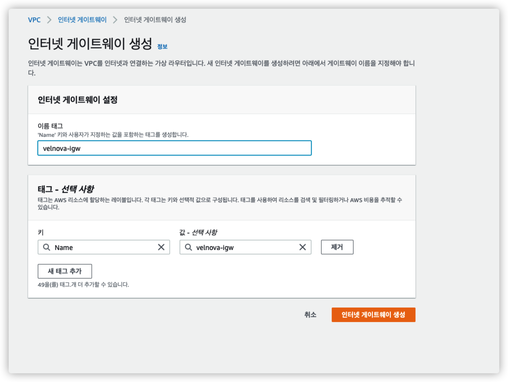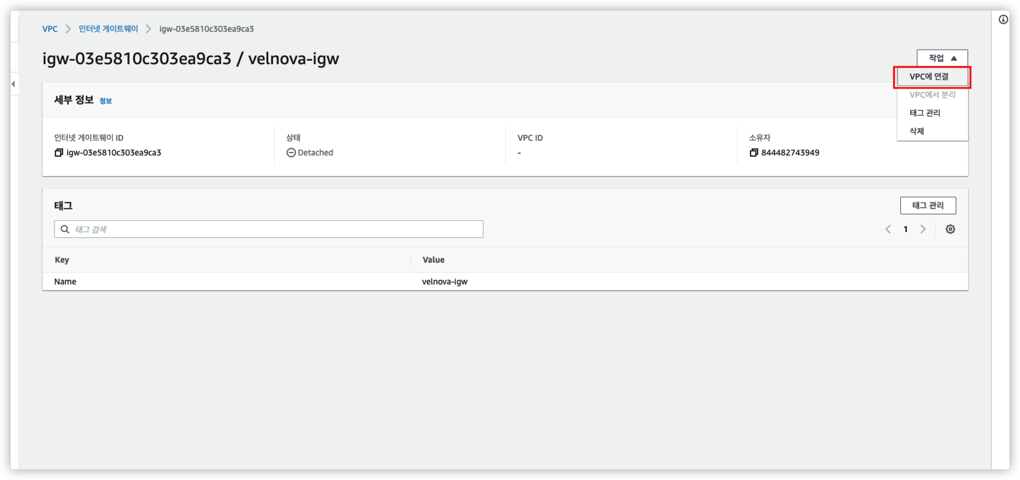 다음으로 인터넷 게이트웨이를 만든 후 vpc에 연결한다.
