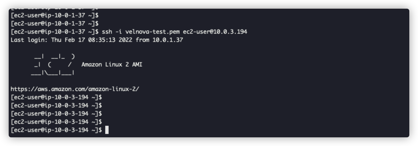 velnova-bastion(public)에 ssh로 접속 후 velnova-test(private)에 접속이 정상적으로 되었다.