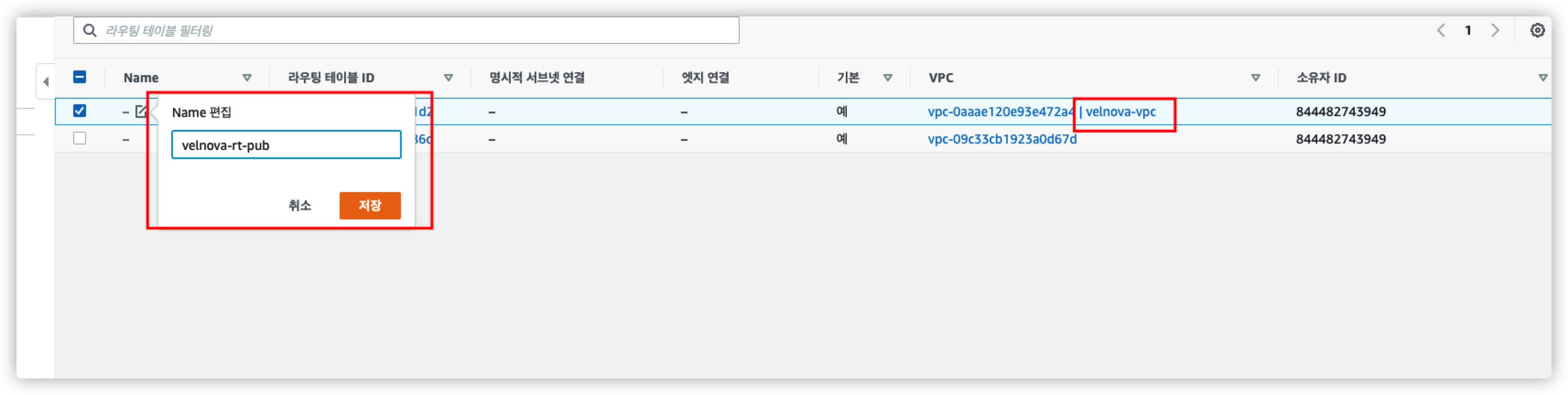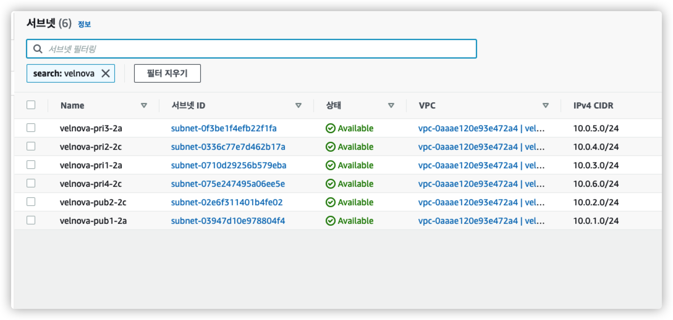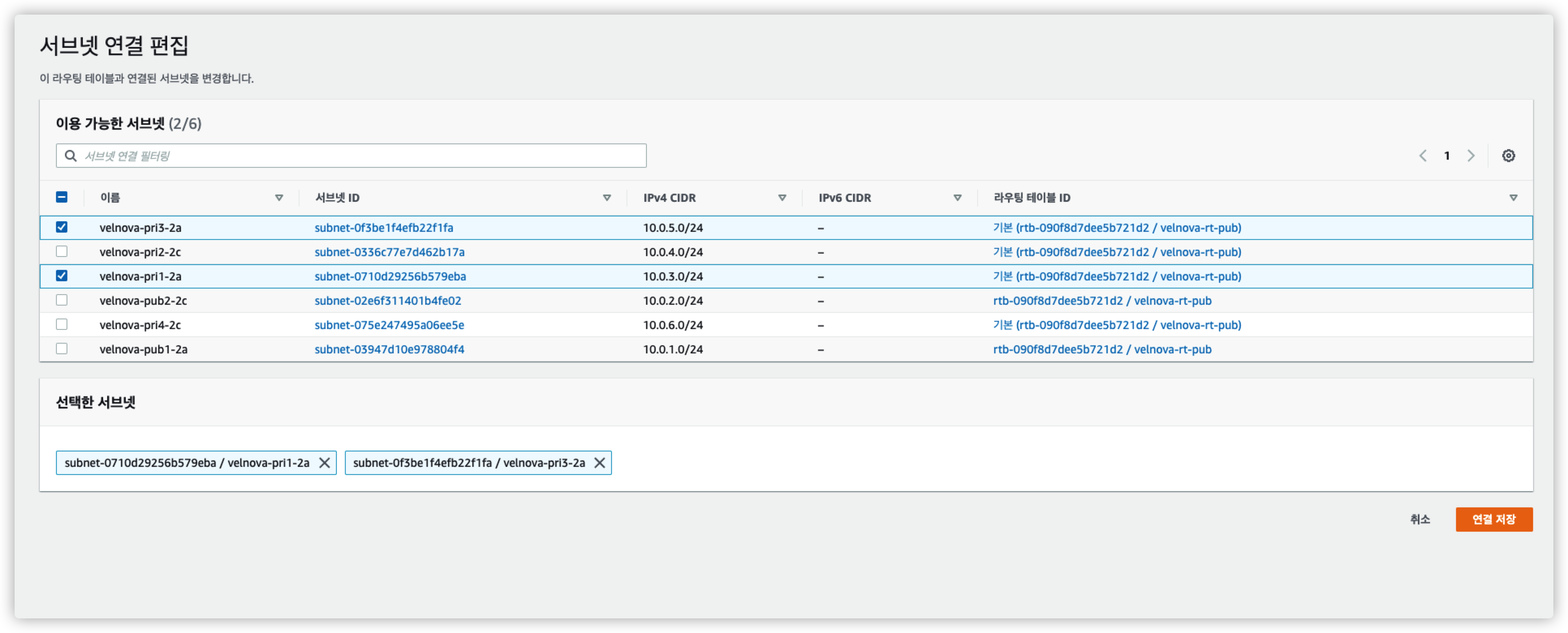 서브넷을 velnova-pub1-2a, velnova-pri-2a를 잘 확인하자.