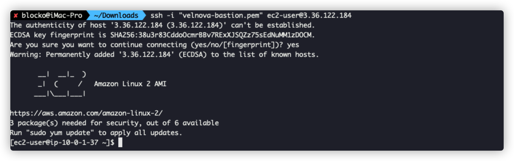 velnova-bastion(public)에 ssh로 접속 후 velnova-test(private)에 접속이 정상적으로 되었다.